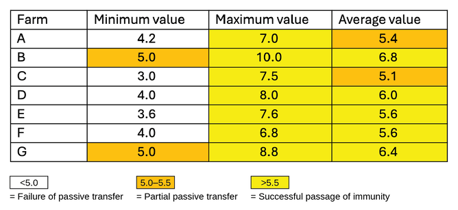 From these results, we can see that all farms had some calves that did not receive full PT, as well as some that did receive adequate antibodies. Averages ranged from partial to good coverage.