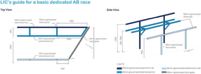 The race needs to allow 1000-1250mm across per cow. Ideally, 5% of the total herd size, or about 20 animals, should be able to fit in the AB race at one time. This means all cows on heat that day should fit in one row.