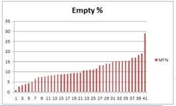 The 6 week in calf rate (WICR) is the best indicator of how mating went for people as it gives everyone a set time period, whereas empty rates vary drastically depending on your mating methods (AI or bull) and mating period (with ranges between 9 weeks to 16 weeks). The 6 WICR is drawn from everyone who aged scanned this season. The overall median 6 WICR was 70%, with the mean being 69%. As discussed, we need to take the empty rate with a pinch of salt as there are huge variations on length and method of mating management.