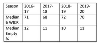 The median empty rate was 9%, and the average being 11%. The table below shows the median values for the last 4 seasons, overall not a huge variation season on season, but bearing in mind that a variation of 1% is the equivalent of 3-7 cows depending on the size of the herd. With that in mind variations in percentages soon add up.