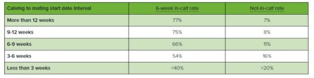 Finally, below is an interesting table from Dairy NZ and shows the change in conception rate depending on the time period from the date the cow calved to when she conceived. It shows how much relies on giving the cow that time needed to clear any post-calving endometritis and allow the uterus to remodel itself and prepare and be ready to maintain another pregnancy.