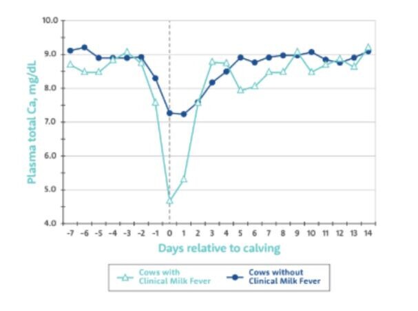 At calving, a dairy cow must switch from being dry to lactating, rapidly adapting to the nutritional demands of milk production. A crucial mineral component of milk is calcium and at calving there is a sharp increased requirement for calcium. To get an idea of how much calcium is required to make colostrum for example you need to know that for every 10 kg of colostrum 23 grams of elemental calcium is required. So a cow producing 25 kg of colostrum will have to replace her total blood calcium level every hour!