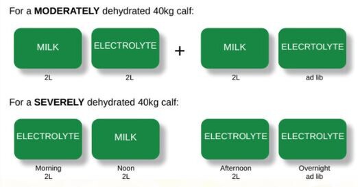 DO NOT mix electrolyte powder with milk unless the label says you can. Bicarbonate interferes with milk clotting in the abomasum so any electrolytes containing bicarbonate should not be fed within 2 hours of a milk feed.