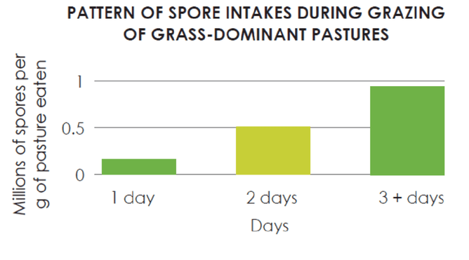 Prevent animals from eating the spores. The spores are concentrated in the dead matter of the grass. Grazing management is important, as seen in the below graph the longer the animals are in the paddock the more spores they are likely to eat (due to grazing down lower). There are also ‘FE safe’ pastures that can be fed: chicory, plantain, legumes and tall fescue. A summer crop is also another option to prevent the ingestion of spores.