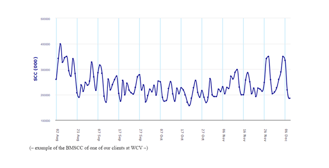 The bulk milk somatic cell count (BMSCC) refers to the concentration of white blood cells produced by the entire herd into the vat.