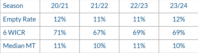 The average empty rate this season was 12%, compared to 11% last season. However, this year we also worked out medians, which sat at 10% (compared with 11% the previous season).