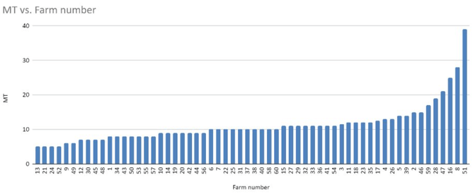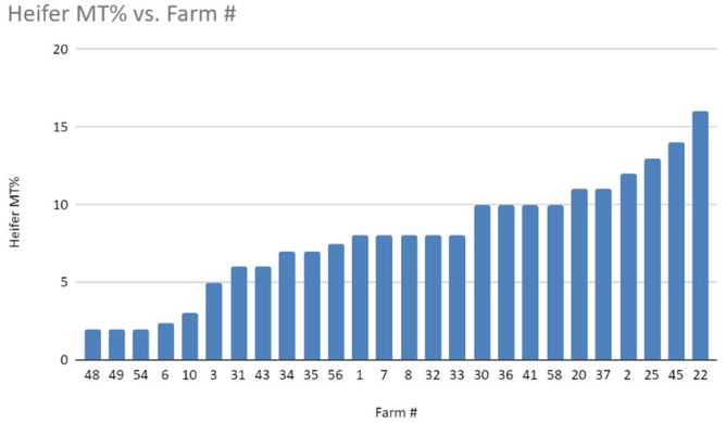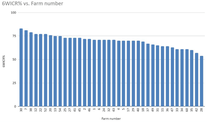 This data enables us to assess how quickly different farms manage to get their cows back in-calf. The range is from 83% to 54%, with an average 6WICR of 69%.