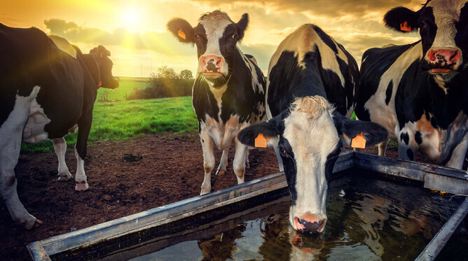 The first sign of heat stress in dairy cows is clustering around the water trough or forming large groups as they try to get shade from each other’s bodies.
