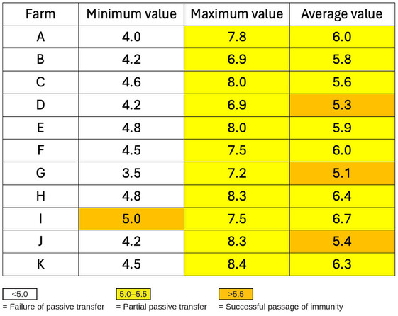 Results less than 5.0 are classed as failure of passive transfer, results between 5.0-5.5 are a partial passive transfer, and anything more than 5.5 is a successful passage of immunity.