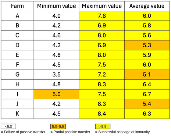 Results less than 5.0 are classed as failure of passive transfer, results between 5.0-5.5 are a partial passive transfer, and anything more than 5.5 is a successful passage of immunity.